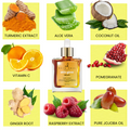 Water, Vitamin C, Grown Turmeric Extract, Virgin Ginger Extract (anti-inflammatory) Aloe Vera organic flower extract, Evening Primrose oil, Jojoba oil, Pomegranate (antioxidants), Cranberry (antioxidants), Red Raspberry (antioxidants), Rose-hip Oil, Cold Pressed Red Raspberry Seed Oil, Cold Pressed Cranberry Seed Oil, Cold Pressed Pomegranate Seed Oil, Cucumber Seed Oil, Unsaponifiables, Bitter Orange Flower Oil, Black Currant Seed Oil, Stearic Acid, Rosemary Leaf Extract.