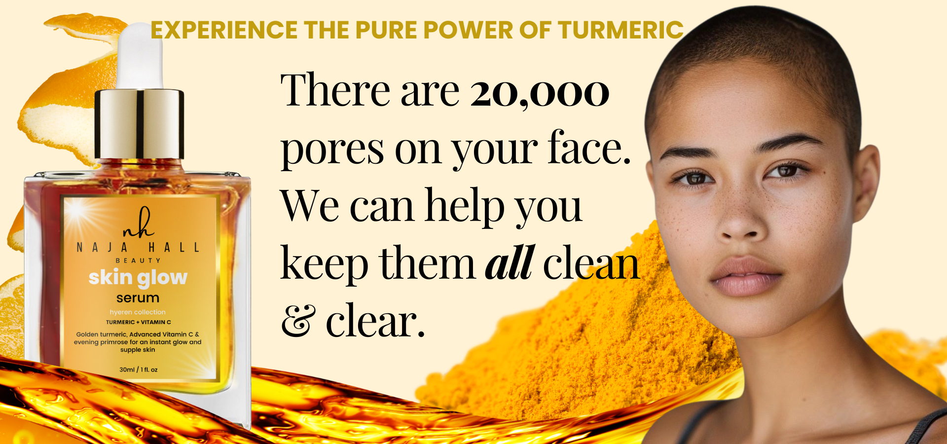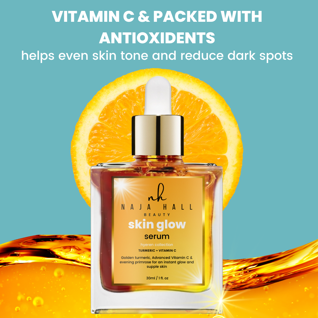 Turmeric Skin Glow Serum has a lightweight formula that hydrates the skin and supports a radiant glow throughout the day. It delivers instant brightening, lifting and firming. Made with pure ingredients and organic herbs, it contains vitamin C and aloe vera which promotes collagen production to help to keep your skin moisturized and glowing. This serum improves the appearance of dark spots, and reduces lines while increasing your skin’s elasticity. This serum is suitable for all skin types, including sensitive skin. It is also vegan, cruelty-free, and non-toxic, safe to use with any other Naja Hall Beauty skin treatments and other products in your regimen.