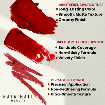 Introducing the UnbotheRED 3 Piece Lip Kit—your ultimate go-to for bold, flawless lips that make a statement and last all day. This essential kit features three perfectly coordinated products designed for intense color payoff, long-lasting wear, and ease of application. Whether you’re rocking a casual look or amping it up for a night out, the UnbotheRED kit is all you need for a striking lip.