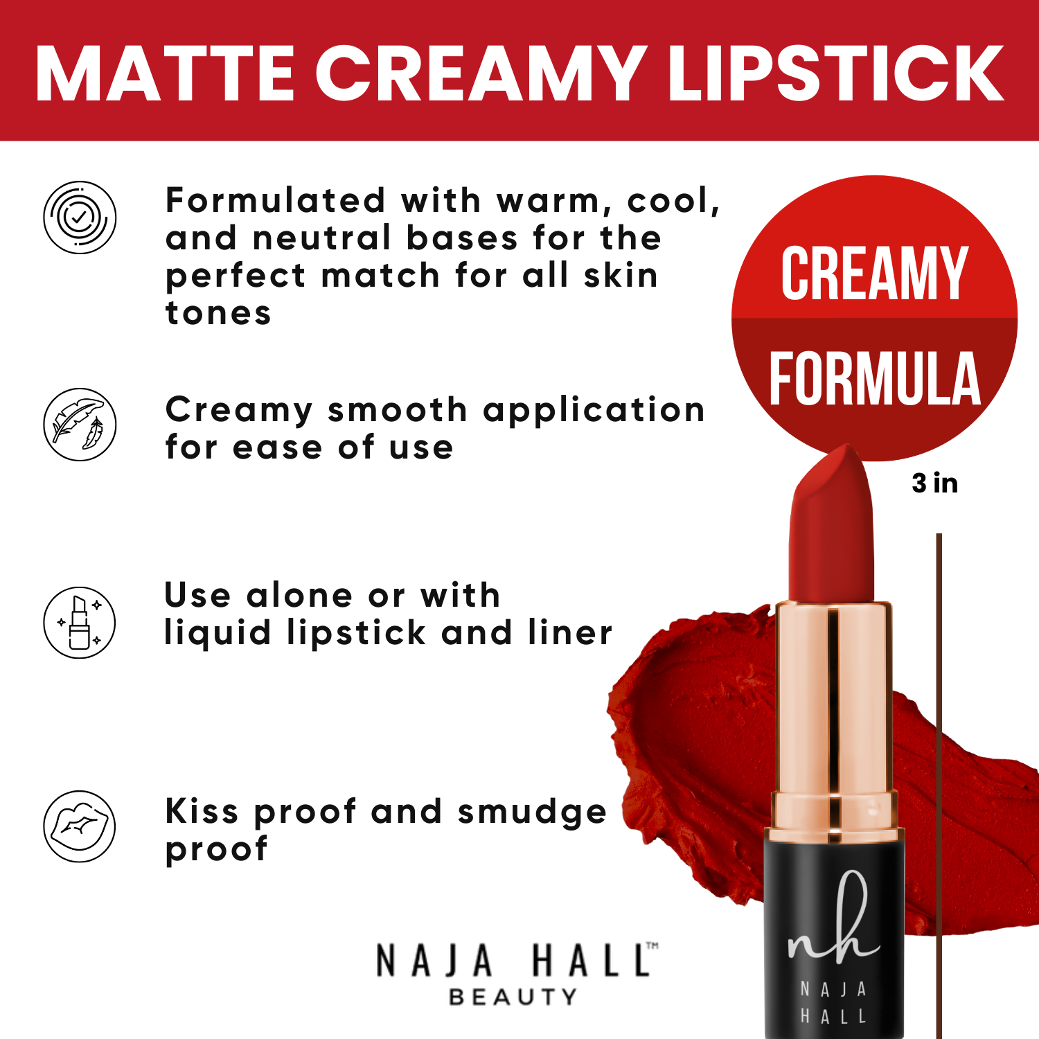 Creamy Matte Lipstick – With a plush mousse texture, our creamy matte lipstick glides on smoothly, delivering a vibrant red color that stays put and feels light on the lips. It’s non-drying, comfortable to wear, and leaves no trace once removed, so you can enjoy bold color without any hassle.